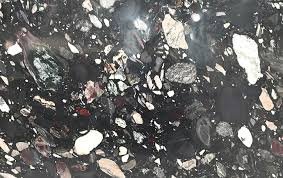 Polished black flecked with golden‑brown pebbles—bold, durable high‑use stone.