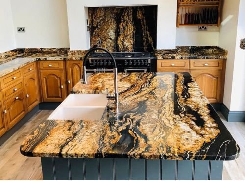 Fusion Gold Granite blends warm gold, brown, and black swirls, delivering a striking and luxurious look to any space.
