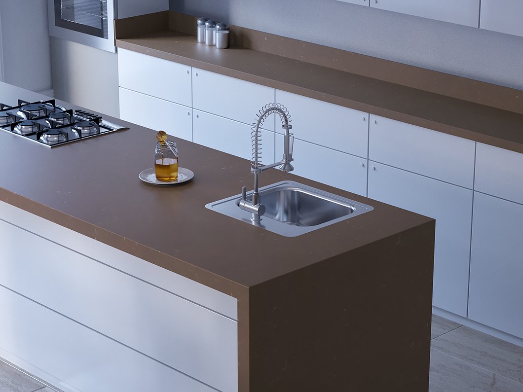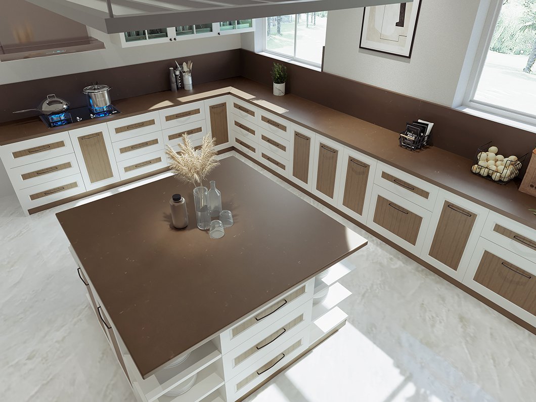 Gold Dust Quartz features rich-brown marble-like foundations highlighted with rustic golden veins that shimmer subtly across the surface. The metallic accents add depth and luxury to darker tones. Its durable, polished quartz withstands heat, impacts, stains, and scratching—providing opulent look with everyday resilience. This design suits moody, upscale interiors seeking dramatic statement materials with refined texture.