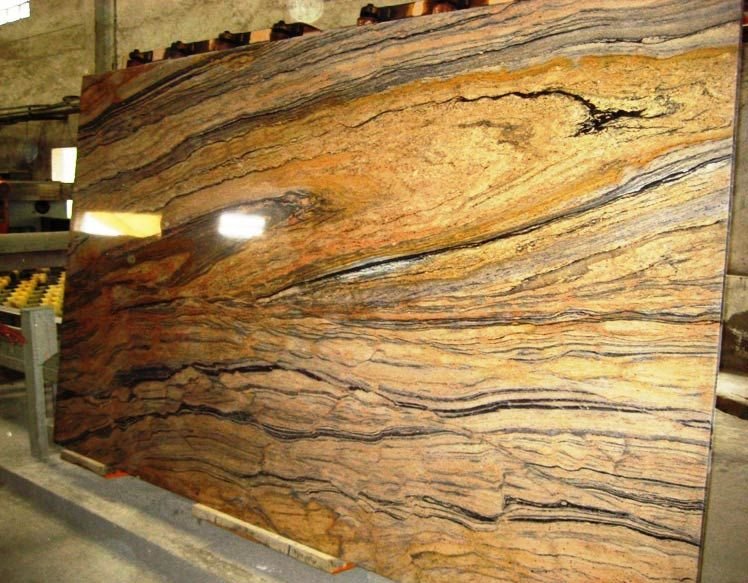 Prada Gold granite features a rich golden-beige backdrop with veins of grey, peach, and darker mineral accents. It polishes to a high shine and is known for its strength and weather resistance.