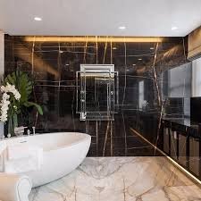 Luxury bathroom vanities, fireplaces, and feature walls.